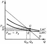 Регулирующий орган должен был бы установить цену на уровне предельных затрат (PK), что привело бы к росту объема производства до уровня, который имел бы место в условиях совершенной конкуренции (QK). Поскольку цена установлена на уровне средних затрат, равных при данном объеме выпуска предельным, предприятие получает только нормальную прибыль. Вследствие роста объемов производства до конкурентного уровня исчезает и ущерб от существования монополии. Рассмотренный случай, когда мощности предприятия точно соответствуют объему спроса, максимально упрощен. Чаще спрос на продукцию естественного монополиста пересекает линию средних затрат слева от точки минимума последней (рис. 8). При эффективном объеме производства (QK) средние затраты оказываются выше предельных и применение принципа ценообразования по предельным затратам приводит к возникновению убытков (L), равных площади прямоугольника PKEGH.