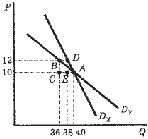 Чистые потери общества в случае пропорционального увеличения цен составят: для товара X - площадь треугольника ABC, для товара Y - площадь треугольника ADE; в абсолютном выражении они будут равны 6 ден. ед.