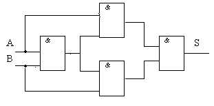 В частном случае при числе входов, равном 2, сумматор по модулю 2 выполняет функцию логического элемента “Исключающее ИЛИ”: на выходе 1 будет только при 1 на одном из входов. Условное обозначениеэлемента “Исключающее ИЛИ” и его реализация на элементах И-НЕ представлены на