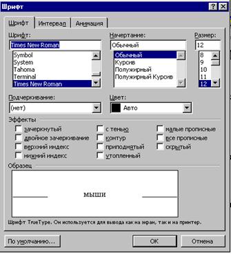 Окно диалога содержит две вкладки: “Шрифт” и “Интервал”. Ниже приведено назначение опций вкладки “Шрифт”.