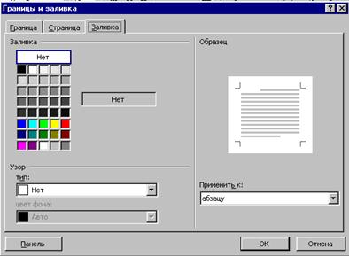 Достаточно интересные эффекты при оформлении фрагмента документа можно получить с помощью вкладки “Заливка” окна диалога “Обрамление и заливка абзаца”. Ниже приведен перечень опций этой вкладки.