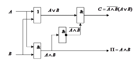 Сравнивая таблицы А и Б мы приходим к выводу, что C=¬(AÙB)(AÚB) П= А/\В На основании последнего выражения можно построить схему одноразрядного сумматора, логика которого oтpaжена в табл. А. Для построения такой схемы нам потребуется одна схема логического сложения (ИЛИ), две схемы логического умножения (И) и одна схема отрицания (НЕ). Надо предусмотреть, чтобы сигналы А и В одновременно (параллельно) поступали на входы схем логического сложения и умножения.