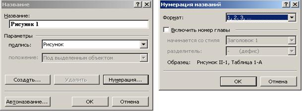 Чтобы вставить нумерованное название под объектом (например, таблицей), нужно дать команду «Вставка®Название». Чтобы вставить ссылку на рисунок, название главы и т.п., дайте команду «Вставка®Перекрестная ссылка». В окне вставки перекрестной ссылки выберите тип ссылки.