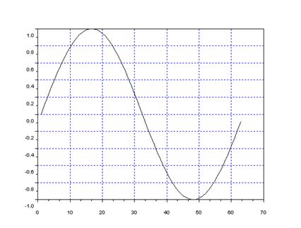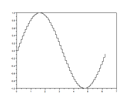 В результате работы программы x=[0:0.1:2*%pi]';xbasc() plot2d2(x,sin(x)) получим