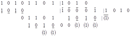 При вычитании с помощью прямого кода признаком отрицательного результата является наличие окончательного заёма за пределы разрядной сетки. В этом случае результат получаем в дополнительном коде и для определения его абсолютной величины необходимо перейти к прямому.