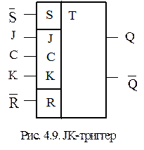 Обозначение JK-триггера с инверсным динамическим входом приведено на рис.4.9. Наклонная черта "смотрит слева - направо - сверху - вниз". JK-триггер функционирует аналогично RS-триггеру, но в отличие от последнего, не имеет запрещенных комбинаций сигналов на входах.