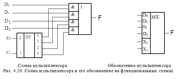 Мультиплексор (MX, MUL), (рис. 4.20.) –это электронное устройство, которое имеет несколько информационных D-входов и один выход F, осуществляющее последовательное подключение входов к выходу в соответствии с адресным кодом, поступающим на управляющие (адресные) входы (х1, х2).