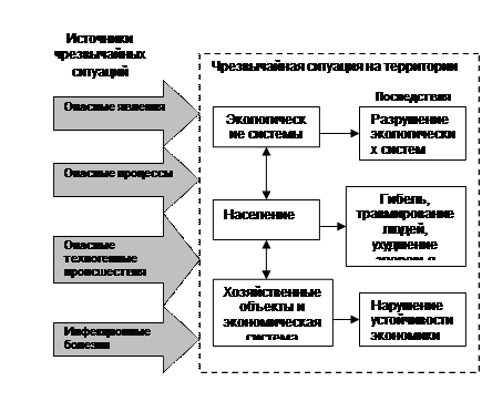 В результате катастрофы, некоторые территории бывают полностью поражены, другие – частично, третьи – слегка, а четвертые вовсе не подвержены разрушениям. ЧС. для человека, экономики и природной среды создаются как за счет деятельности человека в соответствующих средах, так и за счет естественных процессов в этих средах.