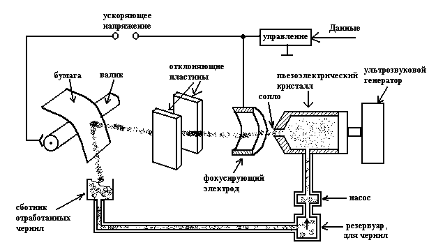 Рис. 4. Принцип действия матричного принтера Для хранения и подачи ленты используют специальную пластмассовую коробочку - картридж. Принтеры стали “интеллектуальными”, т.е. имеют собственное ОЗУ и электронный блок управления для того, чтобы разгрузить основное ОЗУ и не отнимать в процессе печати время у центрального процессора. Существуют ударные точечно-матричные принтеры цветной печати. В них используются 4-цветные ленты, и каждая точка изображения формируется четырьмя последовательными ударами иголки разной силы. Таким образом можно сформировать на бумаге точки всех основных цветов и множества оттенков. Крупнейший производитель точечно-матричных принтеров – фирма “Epson” (Япония). Подробнее о матричных принтерах Все чаще на рабочих местах пользователей персональных компьютеров появляются вместо точечно-матричных струйные или лазерные принтеры. Струйные принтеры вместо головки с иглами имеют головку со специальной краской и микросоплом, через которую эта краска “выстреливается” струйкой на бумагу (и быстро сохнет). Для формирования изображения либо струйка краски может отклоняться специально созданным электрическим полем (так как она электризуется в момент выхода из сопла), либо (чаще) головка имеет столбец из нескольких сопел – наподобие матрицы игл точечно-матричного принтера (рис. 5).