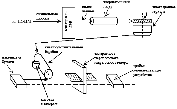 Рис. 6. Принцип действия лазерного принтера Все это происходит с огромной быстротой, благодаря чему лазерные принтеры значительно превосходят обсуждавшиеся выше по скорости работы. Лазерные принтеры -рекордсмены по части количества воспроизводимых шрифтов и качеству рисунков благодаря высочайшей разрешающей способности. Существуют как черно-белые, так и цветные лазерные принтеры. Лазерный принтер работает почти бесшумно. Единственный, но, увы, очень важный параметр, по которому они существенно уступают принтерам ранее описанных типов – стоимость; далеко не всякий может себе позволить приобрести принтер, по стоимости превосходящий точечно-матричный аналог в несколько раз. Лидирующая фирма в производстве струйных и лазерных принтеров – “Hewlett-Packard” (HP), США, хотя в этой области действуют и другие фирмы. Подробнее о лазерных принтерах Существуют и принтеры, работающие на других физических принципах, но по распространенности они значительно уступают тем, которые обсуждались выше.