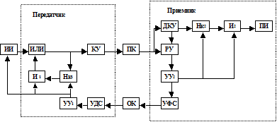 Рассмотрим систему с РОС и ожиданием решающего сигнала (РОС-ож) [14]. На рис.6.11 представлена структурная схема системы с РОС-ож, которая работает следующим образом. Поступающая от источника информации (ИИ) m – элементная комбинация первичного кода через схему ИЛИ записывается в накопитель передатчика (НК1). Одновременно с этим в кодирующем устройстве (КУ) m – элементная комбинация кодируется в циклический код, т.е. добавляются контрольные символы, представляющие собой контрольную последовательность блока (КПБ).