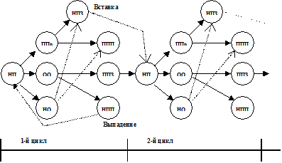 НП - начало передачи; ОО - обнаруженная ошибка; НО - необнаруженная ошибка; Ппр - правильный прием; НПП - неправильный прием подтверждения; ИЗ - искажение запроса; ППП - правильный прием подтверждения; ППЗ - правильный прием запроса Рис.6.13 Правильный прием кодовой комбинации происходит при неискажении комбинации в прямом канале (переход в состояние Ппр) и правильном приеме сигнала подтверждения в обратном канале (переход в состояние ППП). При обнаружении ошибки в переданной кодовой комбинации (переход в состояние ОО) и правильном приеме сигнала запроса (переход в состояние ППЗ) система переходит к повторению (второй цикл). Если в кодовой комбинации присутствует необнаруживаемая ошибка (переход в состояние НО), то по ОК передается сигнал подтверждения и возможен переход в состояние НП следующего цикла (трансформирован сигнал подтверждения в сигнал запроса) либо в состояние ППП (сигнал подтверждения верно принят). Процесс передачи кодовой комбинации может быть закончен в течение одного цикла, а может продолжаться некоторое число циклов. Для уменьшения выставок и выпадений применяют следующие меры. Передаваемые кодовые комбинации циклически нумеруются так, что номер размещается в начале каждой кодовой комбинации или за синхропоследовательностью, служащей для фазирования по циклам. Номер сохраняется за кодовой комбинацией до тех пор, пока кодовая комбинация не будет правильно принята. При повторных передачах кодовой комбинации ее номер сохраняется. Например, номера кодовых комбинаций a1,a2,a3,a4, а последовательность имеет вид {a1,a1,a2,a2,a3.a3,a3,a4,a4,….}. В другом варианте кодовые комбинации, передаваемые один раз, имеют один и тот же номер, например a0, а при повторении производится циклическая нумерация. Например, последовательность в канале имеет вид {a0,a1,a0,a0,a1.a2,a0,a1,a0,a1.a2,….}. Эффективность использования пропускной способности в каналах связи системы с РОС-ож невелика, т.к. прямой канал простаивает в промежутках времени между передачами отдельных кодовых комбинаций и ожидания получения сигналов решения.