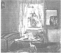 Композиция этой картины интересна, так как многопланова. Пространство изображено так, словно есть несколько точек, с которых мы смотрим на комнату. Во-первых, точка вне картины, с которой мы видим комнату. Во-вторых, точка в самой комнате, откуда смотрят бабушка и дети, отраженные в зеркале. Их вроде бы и нет, но благодаря отражению в зеркале мы знаем об их присутствии. Комната словно разбита на две части: то, что мы видим непосредственно со своей точки, и то, что предстает перед нами как отражение в зеркале. В-третьих, есть еще точка в самой комнате, откуда можно смотреть в окно: зритель словно входит в комнату и видит уже не ее, а пейзаж в окне. Пространство расширяется, хотя видим мы совсем небольшой уголок детской. Три картины в одной: детская, сад и бабушка с внуками. Каждая из них обрамлена: сад — в оконной раме, бабушка с внуками — в раме зеркала, и комната — в раме картины. Из окна льется свет, его потоки заливают детскую, блики играют на занавесках, которые, кажется, слегка колышутся. Усиливает интенсивность освещения и зеркало, выполняя функцию второго окна. В то же время зеркало может восприниматься как еще одна картина. Вместе с зеленью в раскрытые окна веет ароматами сада. Игра света и тени на картине придает атмосфере поэтичность. Обыденность быта соединяется с поэзией детской игры и таинственности (в зеркале бабушка что-то рассказывает детям, возможно, сказку). Детские игрушки ярко освещены, они лежат хоть и в одном месте, но в беспорядке, словно их только что оставили дети, занявшись чем-то другим. Может быть, в сундуке тоже игрушки. Есть в картине и ответ на вопрос о том, что же отвлекло детей от игрушек, — они уютно устроились рядом с бабушкой на мягком диване (его округлые, плавные контуры усиливают ощущение покоя, комфорта) и внимательно ее слушают. А ходики в углу на стене тихо тикают, неумолимо отсчитывая минуты, часы, дни, годы... Когда-то и бабушка была девочкой, и играла здесь, и слушала сказки своей бабушки. И дети вырастут, и детская станет им мала, их жизненное пространство расширится. Но детство никуда не уйдет: оно будет жить здесь, в детской, вместе со старыми игрушками, ходиками, зеркалом, в котором отражается и прошлое, и настоящее, и будущее. Спросим у ребят, что за комната перед ними и почему они так считают. Какое настроение создает у них эта картина? О чем они вспомнили, подумали, что почувствовали, рассматривая ее? Как бы ее назвали? Что в картине создает настроение? После беседы с элементами анализа картины предлагаем детям угадать, о каких произведениях словесного искусства мы будем сегодня говорить.