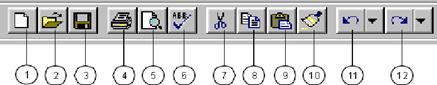 Рис. 2.13,а. Пиктографическое меню программы Word На рисунке 2.13, а: 1 – создать новый документ; 2 – открыть существующий документ; 3 – сохранение активного документа; 4 – печать активного документа; 5 – предварительный просмотр документа перед печатью; 6 – проверка орфографии активного документа; 7 – удаление выделенного фрагмента в буфер; 8 – копирование выделенного фрагмента в буфер; 9 – вставка содержимого буфера в позицию курсора; 10 – копирование формата; 11 – отмена последнего действия; 12 – повторное выполнение последнего отмененного действия.