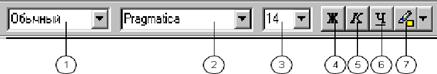 Рис. 2.13,в. Панель форматирования программы Word На рисунке 2.13, в: 1 – применение стиля; 2 – изменение шрифта; 3 – изменение кегля; 4 – установка и отмена полужирного начертания; 5 – установка и отмена курсивного начертания; 6 – установка и отмена подчеркнутого начертания; 7 – выделение цветом выделенного фрагмента.