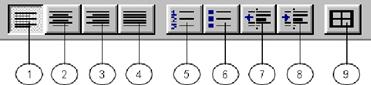 Рис. 2.13,г. Панель форматирования программы Word (продолжение) На рисунке 2.13, г: 1 – выравнивание абзаца по левому краю; 2 – выравнивание абзаца по центру; 3 – выравнивание абзаца по правому краю; 4 – выравнивание абзаца по ширине; 5 – создание нумерованного списка; 6 – создание маркированного списка; 7 – уменьшение отступа или повышение уровня выделенного текста; 8 – увеличение отступа или понижение уровня выделенного текста; 9 – отображение панели инструментов «Обрамление». Приведенные выше панели используются не только в программе Word; они типичны и для других программ семейства MS Office. Для выхода из текстового процессора можно дважды «щелкнуть» по соответствующему Word пиктографическому значку системного меню или нажать комбинацию клавиш Alt + F4. Загрузка документа осуществляется двумя способами: 1) нажатием кнопки с изображением раскрытой папки на панели пиктографического меню; 2) использованием команды меню Файл + Открыть. Далее выбирается нужный файл и нажимается кнопка ОК. Редактирование текста заключается в удалении, добавлении, копировании и переносе фрагментов текста, проверке орфографии с помощью уже известных клавиш клавиатуры или пиктографического меню. Опишем основные приемы редактирования текста в текстовом процессоре WinWord. Удаление буквы (символа) – это простейшая функция редактирования. Если вы случайно нажали клавишу с ненужной буквой при вводе текста, то чтобы удалить ошибочно введенный символ, · расположенный слева от курсора, надо нажать на клавишу Backspace, при этом курсор передвигается на одну позицию влево; · расположенный справа от курсора, надо нажать на клавишу Delete, при этом курсор остается на месте. Для удаления участка текста надо его выделить и нажать клавишу Delete. Как выделить участок текста? Полоса выделения – это невидимая полоса вдоль левой границы окна документа, используемая для выделения текста с помощью мыши. Чтобы выделить текст надо: · установить указатель мыши на полосе выделения рядом с текстом; · нажать левую клавишу мыши и, удерживая ее, передвигать мышь в нужном направлении. Для отмены удаления · на панели инструментов пиктографического меню нажать на кнопку с изображением изогнутой влево стрелки; · или использовать команду меню Правка + Отменить ввод. Добавление текста: установить текстовый курсор на конец абзаца и нажать клавишу Enter, чтобы начать новый абзац. Существует два вида копирования и перемещения участков текста. 1. Ручная техника. На небольших расстояниях: · выделите текст, который хотите переместить или скопировать; · установите указатель мыши на выделенном тексте, нажмите левую кнопку мыши и удерживайте ее – в этот момент вы как бы «схватили» выделенный участок текста. При этом изменится форма текстового курсора и указателя мыши. Текстовый курсор примет форму штриховой вертикальной линии, а в нижнем конце указателя мыши появится небольшой прямоугольник; · нажмите клавишу Ctrl, если хотите скопировать выделенный участок текста; · перемещая указатель мыши, установите штриховой текстовый курсор в ту позицию, куда хотите переместить или скопировать выделенный участок текста, и отпустите кнопку мыши. При переносе текста на большие расстояния воспользуйтесь линейками прокрутки: · выделите необходимый участок текста; · прокрутите текст в окне так, чтобы часть, в которую вы хот