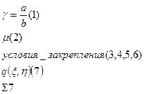 В.З.Власов (1906-1958гг) предложил способ построения функций распределения прогиба пластины, удовлетворяющих как граничным условиям, так и характеру распределения внешней нагрузки. К входным параметрам относятся: a, b, h (м)-(1,2,3), толщина пластины; E(Па), μ(безр)- (4,5), условие закрепления (6,7,8,9); q(x,y) (10) (при расчете в размерном виде) Σ10