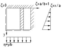 При решении в безразмерном виде решению соответствует бесконечное множество пластин для любых значений а(м), h(м), Е(Па) Далее рассчитываем пластинку в безразмерном виде: По алгоритму статического метода В.З.Власова необходимо: 1.Вырезаем из пластинки полоску по одному направлению 2.Рассматриваем данную полоску как обыкновенную балку
