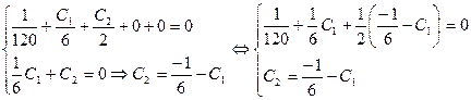 Используем граничные условия для нахождения С1, С2, С3, С4: y(0)=0: 0+0+0+0+С4 =0 => С4=0 yI(0)=0: 0+0+0+C3=0 => C3=0 Используем граничные условия на правом конце балки для подсчета величин С1 и С2: