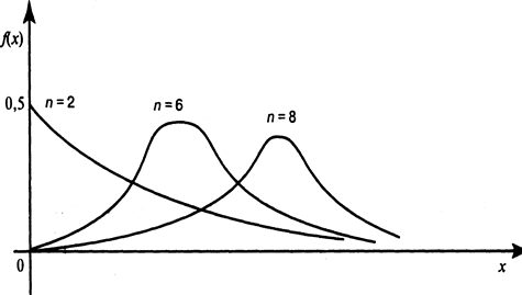 На рисунке 16 показано семейство функций плотностей вероятностей случайных величин c2(n) при разных степенях свободы. Рис16