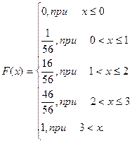 Будем задавать различные значения х и находить для них F(x)= Р{Х < х}: 1. Если х £ 0, то, очевидно, F(x) = Р{Х < 0} = 0; 2. Если 0 < х £ 1, то F(x) = Р{Х < х} = Р{Х = 0} = 3. Если 1 < х £ 2. то F(x)=Р{Х=0}+Р{Х= 1} = 4. Если 2 < x £ 3. то F(x) = Р{Х = 0} + Р{Х = 1} + Р{Х = 2} = 5. Если 3 < х, то F(x) = Р{Х = 0} + Р{Х = 1} + Р{Х = 2} + Р{Х=3}= Итак,