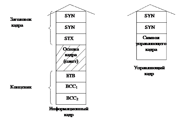 Протокол управления информационным каналом определяет значительное число функций управления информационным каналом, к которому относятся управление процедурами установления и прекращения связи; упаковка передаваемой информации в кадры перед передачей и распаковка после приема; генерация и чтение управляющих кадров; обеспечение прозрачности информационного канала; передача и прием квитанций, повторная передача; управление потоками кадров. В физических каналах используется два метода передачи информации: 1) параллельный (по d цепям передается d символов одновременно) 2) последовательный (бит за битом по одной и той же цепи). Характер управления передачей кадров по информационному каналу зависит от процедуры управления. В современных цепях используется два вида процедур: байт-ориентированные и бит-ориентированные. В байт-ориентированных протоколах осуществляется побайтовая (посимвольная) передача информации. В бит-ориентированных протоколах передается неделимый на байты поток бит. Широко распространенной байт-ориентированной процедурой является BSC фирмы IBM, ставший, по существу, международным стандартом. Байт-ориентированный протокол хорошо увязывается с характеристиками ЭВМ, но из-за передачи значительного числа управляющих символов не очень эффективно использует телефонную сеть. Поэтому в последние годы большое внимание уделяется бит-ориентированным процедурам. Протокол BSC синхронную полудуплексную передачу. В BSC кадры двух типов – информационные и управляющие.