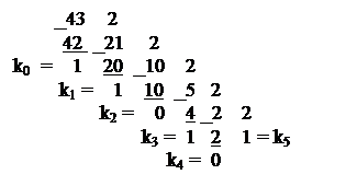 Правило. Целое число A(N1), представленное в системе счисления с основанием N1 переводится в систему счисления с основанием N2 путем последовательного деления числа A(N1) на основание N2, записанное в системе счисления с основанием N1, до получения остатка. Полученное частное следует вновь делить на основание N2 и этот процесс следует повторять до тех пор, пока частное не станет меньше делителя. Получаемые остатки от деления и последнее частное, записанное в системе счисления с основанием N2 является значениями разрядов в порядке возрастания. Пример. Найти двоичное представление для числа А(10) = 43(10) = = к5к4к3к2к1к0 - искомое двоичное представление 43(10) = 101011(2)