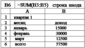 Работа с ЭТ в общем случае предполагает 4 этапа: 1) Формирование структуры ЭТ и ввод исходных данных. 2) Работа с данными ЭТ. 3) Представление данных графически. 4) Печать. Рассмотрим 1-й этап: в рабочий лист заносится заголовок таблицы, названия ее строк и столбцов; в ячейки таблицы вводятся исходные данные, функции, формулы; осуществляется обрамление и форматирование ячеек таблицы. Поясним это на примере: простейший квартальный отчет о доходах