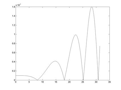 >> f=inline('sin(0.01*x.^2)'); % задание дифференцируемой % функции >> dx=0.01; % шаг изменения координатной сетки >> x=0:dx:10*pi; % вычисление координат узлов >> yf=feval(f,x); % вычисление значений функции в узлах % выполнение процедуры численного дифференцирования >> N=length(x); >> m=1:N-1; >> df(m)=yf(m+1)-yf(m) >> plot(df) % визуализация производной функции (рис. 6.1) >> f1=inline('0.02*x.*cos(0.01*x.^2)'); % задание функции, % описывающей первую % производную >> ya=feval(f1,x); % вычисление значений первой производной по % аналитической формуле >> plot(x(m),abs(yf(m)-ya(m)); % визуализация разности между % численными и аналитическими % значениями производной (рис. 6.2)