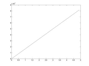 Далее необходимо выполнить следующую последовательность команд: >> x0=0; % левая граница отрезка интегрирования >> x1=5; % правая граница отрезка интегрирования >> y0=1.3; % начальное условие >> N=50; % число узлов разбиения отрезка интегрирования >> [X Y]=Euler_g9(y0,x0,x1,N); % нахождение численного решения % задачи Коши >> i=1:length(X); >> Z(i)=y0+1/3*X(i).^3; % вычисление значений точного решения >> plot(X,Z,X,Y,':') % визуализация точного и численного решений % (рис. 9.2) >> plot(X,abs(Z-Y)) % визуализация разности между численным и % точным решениями ДУ (рис. 9.3)