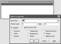 Окно точек останова (слева) и окно добавления новой точки (справа) (2)Окно наблюдения Наблюдать за состоянием переменной или выражения можно с помощью специального окна, вызываемого опцией View|Debug windows|Watches. Окно наблюдения используется в отладочном режиме для наблюдения за изменением значений выражений, помещенных в это окно. Для добавления нового выражения следует щелкнуть по окну правой кнопкой мыши и выбрать опцию New Watch. В строке Expression ввести выражение. Окно Repeat count определяет количество показываемых элементов массивов данных; окно Digits указывает количество значащих цифр для отображения вещественных данных; переключатель Enabled разрешает или запрещает вычисление выражения. Остальные элементы определяют вид представления значения. Значения переменных можно также посмотреть во время останова программы, наведя курсор мыши на переменную в тексте кода.
