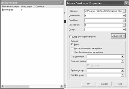 Фрагмент окна редактора в режиме отладки Чтобы установить/снять точку контрольного останова, достаточно щелкнуть мышью по служебной зоне слева от нужной строки или установить в эту строку текстовый курсор и нажать клавишу F5. При нажатии клавиши F7 выполняются те же действия, что и при нажатии клавиши F8, однако, если в текущей строке содержится вызов подпрограммы пользователя, программа прервет свою работу перед выполнением первого исполняемого оператора этой подпрограммы, т. е. клавиша F7 позволяет прослеживать работу вызываемых подпрограмм. После трассировки нужного фрагмента программы можно продолжить нормальную ее работу, нажав клавишу F9. (5)Действия в точках прерывания В Delphi с любой точкой можно связать одно или несколько действий. Для этого нужно активизировать окно точек останова, вызвать его локальное меню (щелчок правой кнопкой) и выбрать продолжение Properties. В появившемся окне свойств щелкнуть по кнопке Advanced. В нижней части окна имеется панель Actions, с помощью которой и определяются действия для точки останова, указанной в верхней части окна: · Break – останов перед выполнением помеченного оператора; · Ignore subsequent exceptions – если переключатель установлен, игнорируются все возможные последующие исключения в текущем отладочном сеансе до очередной точки останова, в которой, возможно, это действие будет отменено; · Handle subsequent exceptions – после установки этого переключателя отменяется действие предыдущего переключателя и возобновляется обработка возможных исключений; · Log message –можно указать произвольное сообщение, связанное с точкой останова; · Eval expression – можно вычислить некоторое выражение и поместить его результат в это сообщение.