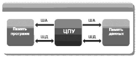 Исторически первой появилась гарвардская структура, разработанная Говардом Эйкеном в конце 1930-х годов в Гарвардском университете и реализованныя в компьютере Марк-1. В первом компьютере Эйкена «Марк I» для хранения инструкций использовалась перфорированная лента, а для работы с данными — электромеханические регистры. Это главный отличительный признак – раздельное хранение и обработка команд и данных (использование раздельных адресных пространств). Это позволяло одновременно пересылать и обрабатывать команды и данные, благодаря чему значительно повышалось общее быстродействие. Принципиально невозможно производить операцию записи в память программ, что исключает возможность случайного разрушения управляющей программы в случае неправильных действий над данными. Она почти не использовалась до конца 70-х годов. Однако оказалось, что в микрокомпьютерах объем данных очень невелик по сравнению с управляющей программой. Применение отдельной небольшой по объему памяти данных способствует сокращению длины команд и ускорению поиска информации в памяти данных. Гарвардская архитектура применяется в микроконтролерах, где требуется обеспечить высокую надёжность работы аппаратуры. Однако такая схема имеет очевидный (это ещё вопрос) недостаток — высокую стоимость. При разделении каналов передачи команд и данных процессор должен иметь почти в два раза больше выводов (раздельно для шины адреса и шины данных).