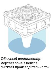 Поговорим о "мёртвой зоне". В обычных, осевых, вентиляторах моторчик расположен в центре. Иногда моторчик занимает значительную часть "активной" площади вентилятора, площади, образуемой окружностью пропеллера. Под моторчиком скорость воздушного потока несравнимо ниже, чем под лопастями. Уже на некотором расстоянии скорости воздуха под вентилятором выравнивается на всей площади, но это расстояние уже может быть за пределами основания радиатора. К сожалению, как правило, "мёртвая зона" расположена над центром радиатора, в том месте, где расположено ядро процессора. Естественно, эта "мёртвая зона" негативно сказывается на охлаждении.