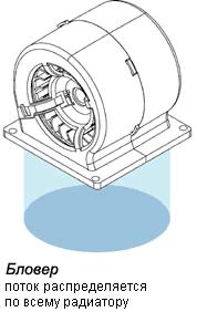 Радиальные вентиляторы получили название "бловеры" (от англ. Blow - дуть). В бловере воздушный поток направляется под углом 90 градусов к оси моторчика. Вместо пропеллера с лопастями в радиальных вентиляторах используются барабаны, или как их принято называть, крыльчатки. Этот тип вентиляторов требует установки моторчиков с большей мощностью, бловеры имеют большие физические размеры и большую стоимость. Но несмотря на эти, казалось бы, недостатки, радиальные вентиляторы имеют ряд преимуществ. Прежде всего, воздушный поток в них менее обладает меньшей турбулёнтностью, большей скоростью, а кроме того - радиальные вентиляторы лишены "мёртвой зоны".