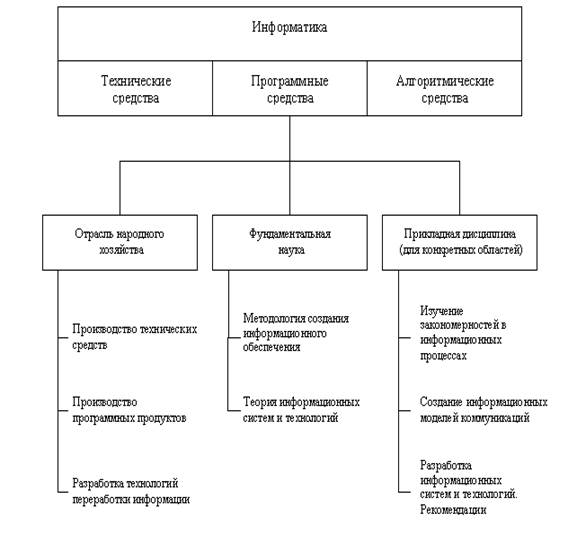 Рис. 1. Структура информатики как отрасли народного хозяйства, науки, прикладной дисциплины Информатика как отрасль народного хозяйства занимается производством компьютерной техники, программных продуктов и разработкой современной технологии переработки информации. Информатика как фундаментальная наука занимается разработкой методологии создания информационного обеспечения процессов управления любыми объектами на базе компьютерных информационных систем. Цель фундаментальных исследований в информатике – получение обобщенных знаний о любых информационных системах, выявление общих закономерностей их построения и функционирования. Информатика как прикладная дисциплина занимается: · изучением закономерностей в информационных процессах (накопление, переработка, распространение); · созданием информационных моделей коммуникаций в различных областях человеческой деятельности; · разработкой информационных систем и технологий в конкретных областях и выработкой рекомендаций относительно их жизненного цикла: для этапов проектирования и разработки систем, их производства, функционирования и т.д. Особенно следует выделить в информатике методы математического моделирования и методы распознавания образов, практическая реализация которых стала возможной благодаря достижениям компьютерной техники. Главная функция информатики заключается в разработке методов и средств преобразования информации и их использовании в организации технологического процесса переработки информации. ОПРЕДЕЛЕНИЕ. Информатика — это техническая наука, систематизирующая приемы создания, хранения, воспроизведения, обработки и передачи данных средствами вычислительной техники, а также принципы функционирования этих средств и методы управления ими. Инфоpматика — комплексная научная дисциплина с широчайшим диапазоном применения. Её приоритетные направления: · pазpаботка вычислительных систем и пpогpаммного обеспечения; · теоpия инфоpмации, изучающая процессы, связанные с передачей, приёмом, преобразованием и хранением информации; · математическое моделирование, методы вычислительной и прикладной математики и их применение к фундаментальным и прикладным исследованиям в различных областях знаний; · методы искусственного интеллекта, моделирующие методы логического и аналитического мышления в интеллектуальной деятельности человека (логический вывод, обучение, понимание речи, визуальное восприятие, игры и др.); · системный анализ, изучающий методологические средства, используемые для подготовки и обоснования решений по сложным проблемам различного характера; · биоинформатика, изучающая информационные процессы в биологических системах; · социальная информатика, изучающая процессы информатизации общества; · методы машинной графики, анимации, средства мультимедиа; · телекоммуникационные системы и сети, в том числе, глобальные компьютерные сети, объединяющие всё человечество в единое информационное сообщество; · разнообразные пpиложения, охватывающие производство, науку, образование, медицину, торговлю, сельское хозяйство и все другие виды хозяйственной и общественной деятельности. Роль информатики в развитии общества чрезвычайно велика. С ней связано начало революции в области накопления, передачи и обработки информации