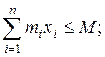 1. Задача о рюкзаке. Рассмотрим классическую задачу ЦП, так называемую задачу о рюкзаке (или ранце), которая относится к классу задач с неделимостями. Содержательный смысл задачи состоит в следующем. Турист, отправляясь в поход, собирает рюкзак, масса которого не должен превышать величину М (например, в кг). Турист может положить в рюкзак n видов неделимых предметов, причем i -й предмет имеет массу