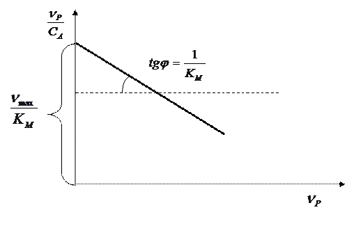 Если механизм ферментативного катализа и уравнение Михаэлиса, которое его описывает, верны, то зависимость спрямляется в координатах . По тангенсу угла наклона прямой определяют , а по отрезку, отсекаемому на оси Oy, находят . Для проверки механизма и оценки параметров этот график более надежный.