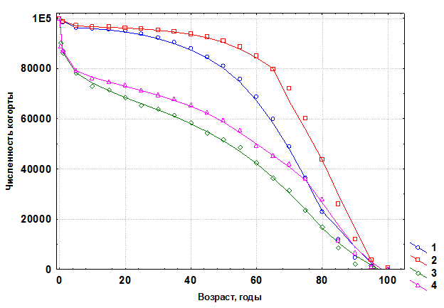 Кривые выживания одновозрастных особей отдельных видов живых организмов, как известно из курса общей экологии, можно подразделить на три основных типа. Для человека характерна кривая выживания типа I. Она соответствует ситуации, при которой смертность очень мала на протяжении большей части жизненного цикла, но после превышения некоторого возраста, равного средней продолжительности жизни, резко возрастает и все особи погибают за очень короткий срок. Кривая выживания для человека представляет сильно выпуклую кривую. Поскольку средняя продолжительность жизни женщин практически во всех человеческих популяциях выше, чем мужчин, кривая выживания для женщин несколько сдвинута вверх и вправо от аналогичной кривой для мужчин.