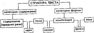 Поскольку в лингвистике текста много дискуссионного, то и вопрос категориях текста неоднозначен. Бесспорно принято большинством ученых деление категорий на содержательные и структурные (В.В. Одинцов, И.Р. Гальперин, З.Я. Тураева и др.). Однако принципы их выделения, количество, названия целого ряда категорий далеко не однозначны. В.В. Одинцов в структуре текста выделяет всего две категории: содержания и формы. К категориям содержания он относит собственно содержание (предмет речи), тему, идею произведения; к категориям формы композицию, язык, приемы изображения, а сюжет соединяет категории содержания и категории формы (схема 2) [ Одинцов В.В. Композиционные типы речи. С. 139]1. И.Р. Гальперин и З.Я. Тураева также делят категории текста на содержательные и структурные. Однако И.Р. Гальперин не проводит между ними столь четкого разграничения, так как отдельные категории одновременно являются и содержательными, и структурными (континуум, подтекстовая информация и др.).