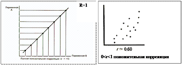 Коэффициент корреляции показывает силу линейной зависимости между зависимой переменной х и независимой переменной у. Наглядным изображением корреляционной таблице служит корреляционное поле. Оно представляет собой график, где на оси абсцисс откладывают значения Х, по оси ординат – У, а точками показывается сочетание Х и У. Получаем «облако» точек, по их концентрации в определенном направлении можно судить о наличии связи. Коэффициент корреляции принимает значения в интервале от -1 до + 1.