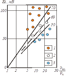 Характерным для них является то, что сопротивления продуктивных и водоносных коллекторов различаются несущественно (не более чем в 2 – 3 раза). Для оценки характера насыщения таких коллекторов применяют комплекс методов, например, методы ПС и кажущегося сопротивления (рис. 5.4). На графике сопоставления Есп и , построенном в полулогарифмическом масштабе, проводят линию зависимости . Признаком продуктивности является расположение точки, соответствующей данному коллектору, выше линии . При изменении глинистости коллекторов в широких пределах проводят семейство линий с различным значением Ксп=const, которое уменьшается с ростом глинистости [3].