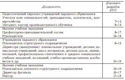 Отнесение должностей к разрядам осуществляется в соответствии с отраслевыми тарифно-квалификационными справочниками на основании решений тарифных комиссий образовательных учреждений. При утверждении ЕТС было установлено также и распределение должностей работников образования по тарифным разрядам (табл. 6.10) При расчете фонда оплаты труда работников образовательных учреждений учитываются также все предусмотренные законодательными и нормативными документами дополнительные выплаты: надбавки, доплаты, компенсации и др. Например, полученный в результате расчетов суммарный фонд заработной платы педагогических работников общеобразовательных школ увеличивается на надтарифный фонд, определяемый процентом от фонда заработной платы и составляющий для школ 25%. Надтарифный фонд предназначен для установления доплат за дополнительные виды проводимых учителями работ—проверку тетрадей, классное руководство ит.п. Таблица 6.10. Распределение должностей работников образования по разрядам ЕТС
