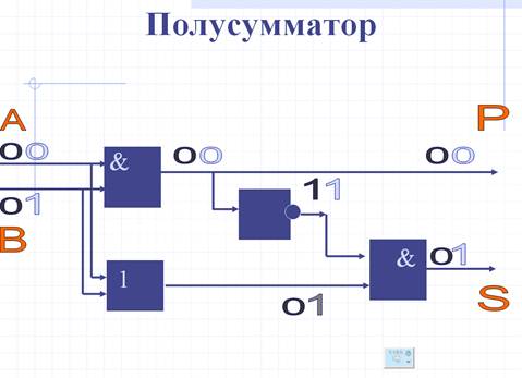 Вентили И, или и НЕ, описанные ранее, соединяются в различные комбинации, которые образуют, электронные схемы, называемые полусумматорами и полными сумматорами. С помощью таких схем компьютер производит двоичное сложение. С некоторыми изменениями эти схемы могут применяться также для вычитания, умножения и деления. Простейшая из приведенных ниже схем, полусумматор, может складывать две двоичные цифры, выделяя результирующий разряд и бит переноса. Однако такая схема не имеет третьего входа, на который мог бы поступать перенос от предыдущего разряда суммы. Поэтому обычно полусумматор используется лишь в младшем разряде суммирующей логической схемы, где не может быть переноса от предыдущего разряда. Полный сумматор складывает две двоичные цифры с учетом переноса от сложения в предыдущих разрядах и поэтому может использоваться на любом месте в цепочке сумматоров, производящих сложение многоразрядных двоичных чисел. Схемы полусумматора и полного сумматора можно построить путем различных комбинаций логических элементов. Изменив схему соединения элементов, можно воспользоваться и другими логическими вентилями. Три четверти работы полусумматора выполняет один вентиль ИЛИ, поскольку он выдает 0, когда на оба его входа поступает 0, и 1, когда на одном из его входов 1. К сожалению, на его выходе 1 появляется и тогда, когда на оба входа поступает 1, а нужно, чтобы на выходе схемы был 0 и 1 в качестве переноса на дополнительном выходе. Для всех математических и логических операций важно лишь то, чтобы схема, как бы она ни была построена, выдавала на выходе 1 или 0 всегда, когда это должно быть. На приведенных ниже рисунках изображены самые простые и понятные схемы сумматоров. Линии с высоким уровнем напряжения, т. е. несущие значение 1, показаны красным цветом, линии низкого напряжения, соответствующие 0, черным. Точки разветвлений, т. е. места, где один входной сигнал направляется на два или более вентилей, отмечены черными точками.