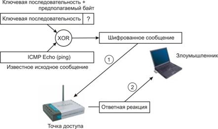 Индуктивное вычисление секретного ключа шифрования WEP представляет собой процесс воздействия на беспроводную локальную сеть для получения определенной информации и относится к классу активных сетевых атак. Как было сказано ранее, при потоковом шифровании выполняется двоичное сложение по модулю 2 (XOR) исходного сообщения с ключевой последовательностью с целью получения шифрованного сообщения. Этот факт лег в основу данной атаки. Высокая эффективность атаки индуктивного вычисления ключа, предпринимаемой в беспроводной локальной сети IEEE 802.11, объясняется отсутствием действенных средств контроля целостности сообщений (Message Intgrity Check, MIC). Принимающая сторона не в состоянии распознать факт модификации содержимого фрейма в процессе передачи по общедоступному радиоканалу. Более того, значение ICV (Integrity Check Value), предусмотренное стандартом для контроля целостности сообщений, вычисляется с помощью функции CRC32 (32-bit Cyclical Redundancy Check, контроль с помощью циклического 32-битного избыточного кода), которая подвержена атакам с манипуляцией битами. Таким образом, в отсутствии механизмов контроля целостности сообщений беспроводные локальные сети подвержены активным атакам: повторному использованию вектора инициализации (IV Replay) и манипуляции битами (Bit-Flipping). 1) Повторное использование вектора инициализации (Initialization Vector Replay Attacks), представляет собой разработанную теоретически и реализованную практически активную сетевую атаку в беспроводной локальной сети, существующую в нескольких разновидностях, одна из которых описана ниже и проиллюстрирована рис. 8.5.