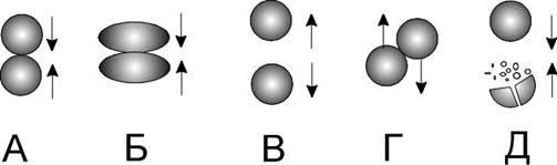 Рис. 2. Различные типы взаимодействия частиц: А – контакт без деформации; Б – пластическая деформация; В – отталкивание (упругое взаимодействие); Г – скольжение; Д – разрушение.