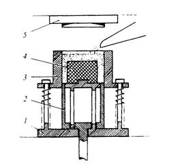 Рис. 5. Пресс-форма для квазиизостатического прессования: 1 – корпус; 2 – выталкиватель; 3 – матрица; 4 – эластичный пресс-буфер; 5 – пуансон.