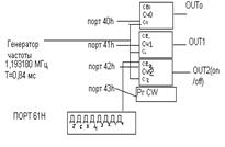 OUT0 – есть прерывание int8 (прерыв-е от таймера). OUT1 в 1 ПК использ-ся для генерации динамической памяти. Прерывание от таймера int8 генерируется каждые 55 мс или 18,2паза/с. Начальное значение загруженное в сч.=0. Установ. Режим 3 чтение/запись 2 байта, двоичный счет. Сч.2 запрограм.на работу режима 3. Начальное значение М опред-т частоту звучания динамика. Бит Д7 порта 61h позволяет заблокировать и разблокировать клавиатуру: 1-заблок.клав. 0-разблок.клав.