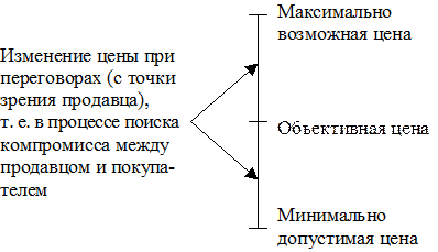Расчет издержек производства. Выявив цену товара, которая может сложиться на рынке, предпринимателю следует выяснить размер собственных расходов, связанных с производством данного товара. В данном случае (в отличие от определения возможной цены), в основу предпринимательских расчетов закладываются не средние и не текущие расходы по производству данного (или аналогичного) товара, а предельно высокие расходы для снижения степени возможного риска. Расходы предпринимателя, связанные с производством товара, называются издержками производства и обычно рассчитываются по отношению к товарной единице по формуле: Ип = Ар + Ао + Сс + Ст + Нр + Оп.о , где Ип – издержки производства; Ар – административные и управленческие расходы; Ао – амортизационные отчисления; Сс – стоимость сырья; Ст – стоимость труда; Нр – накладные расходы; Оп. о – обязательные платежи и отчисления. Предпринимателю важно зафиксировать, по крайней мере, хотя бы три ценовых показателя на один и тот же товар. Поскольку любой предприниматель хочет получить максимально возможный эффект, то первая цена, фиксируемая им, – это максимально возможная цена на товар. Она может быть на рынке или только в воображении предпринимателя. Вторая цена – это объективная цена, о которой мы будем говорить позже. И третья цена – это минимально допустимая цена (с точки зрения предпринимателя). Таким образом, графически эти три фиксируемые предпринимателем цены можно было бы изобразить в следующей форме (рис.):