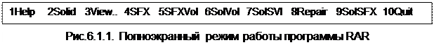 Программа архивации RAR Другой популярной программой архивации является программа RAR. Главными особенностями архиватора RAR являются следующие: - работает в двух режимах: полноэкранного интерактивного интерфейса и обычного интерфейса командной строки. - работает с архивами, созданными другими архиваторами (ZIP, ARJ, LZH); - использует высокоэффективный метод сжатия solid (на 10 – 15 % выше, чем обычно); - позволяет добавлять файловые и архивные комментарии; - имеется возможность частичного восстановления поврежденных архивов; - имеется защита архива от изменения; - позволяет просматривать архивные файлы в упакованном виде. Принцип работы архиватора в режиме интерфейса командной строки аналогичен принципу работы с архиватором ARJ. Полноэкранный интерактивный режим Запуск программы. Запуск программы в полноэкранном режиме осуществляется из командной строки командой RAR без параметров. После запуска программы на экране появляется окно (рис. 6.1.1.) Левая панель содержит список файлов и каталогов, как в среде Volcov Commander. Правая панель содержит два раздела: память – Memory и установки – Settings. Внизу экрана размещается строка помощи. При нажатии Alt выводится подсказка о дополнительных функциях, вызываемых одновременным нажатием клавиши Alt и одной из функциональных клавиш. При нажатии F1 на экран выводится информация о назначении всех функциональных клавиш и их комбинаций (табл. 6.1.1, 6.1.2). При выделении архивного файла и нажатии клавиши Enter программа переходит в сам архив, как в каталог, то же самое что при вводе команды RAR <имя архивного файла> После входа в архив работа с ним осуществляется как в обычном каталоге. В списке архивных файлов имена файлов, закодированные паролем, отмечаются звездочкой "*". На правой половине экрана выводятся сведения об архиве. Здесь могут использоваться символические обозначения: Þ - файл продолжается в следующем томе; Ü